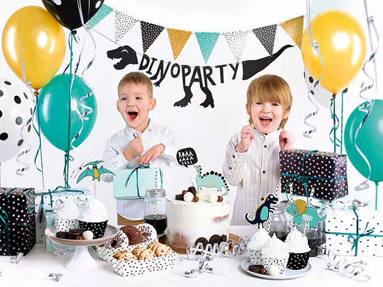 Party decorations set – Dinosaurs, set contains: banner Dino Party (1 piece), paper garland (1 piece), muffin wrappers (6 pieces), cake topper (5 pieces), treat cases (2 pieces), straws (10 pieces), silver whistles (6 pieces), balloons (mix of designs, 6 pieces), silver streamers (1 piece) and bottle green satin ribbon (width 6 mm, 1 piece)